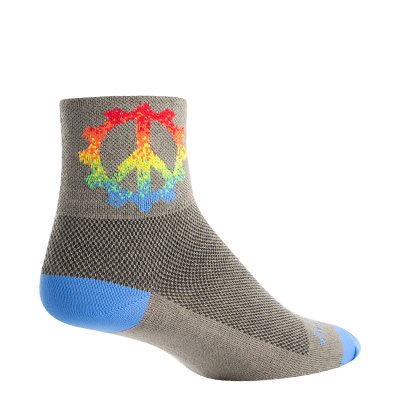 It’s no coincidence that a peace sign fits so perfectly inside a bike gear. Riding connects us to our breath, nature, and each other. These heathered grey classic socks make the perfect base for the full rainbow gradient peace gear on each side of the ankle. They’ll hug your feet forever, so you can take as long as you need.